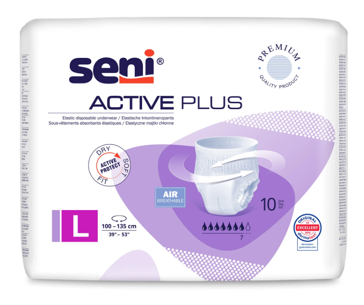 Chilotul absorbant Seni Active Plus reprezintă soluţia ideală pentru persoanele active cu probleme de incontinenţă gravă, sau pentru noapte. Este recomandat de asemenea pentru pacienţii în reabilitare fizică.