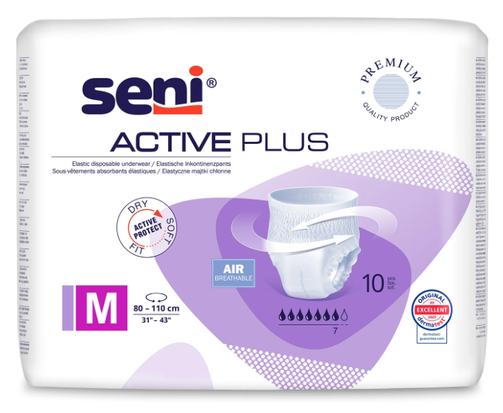 Chilotul absorbant Seni Active Plus reprezintă soluţia ideală pentru persoanele active cu probleme de incontinenţă gravă, sau pentru noapte. Este recomandat de asemenea pentru pacienţii în reabilitare fizică.